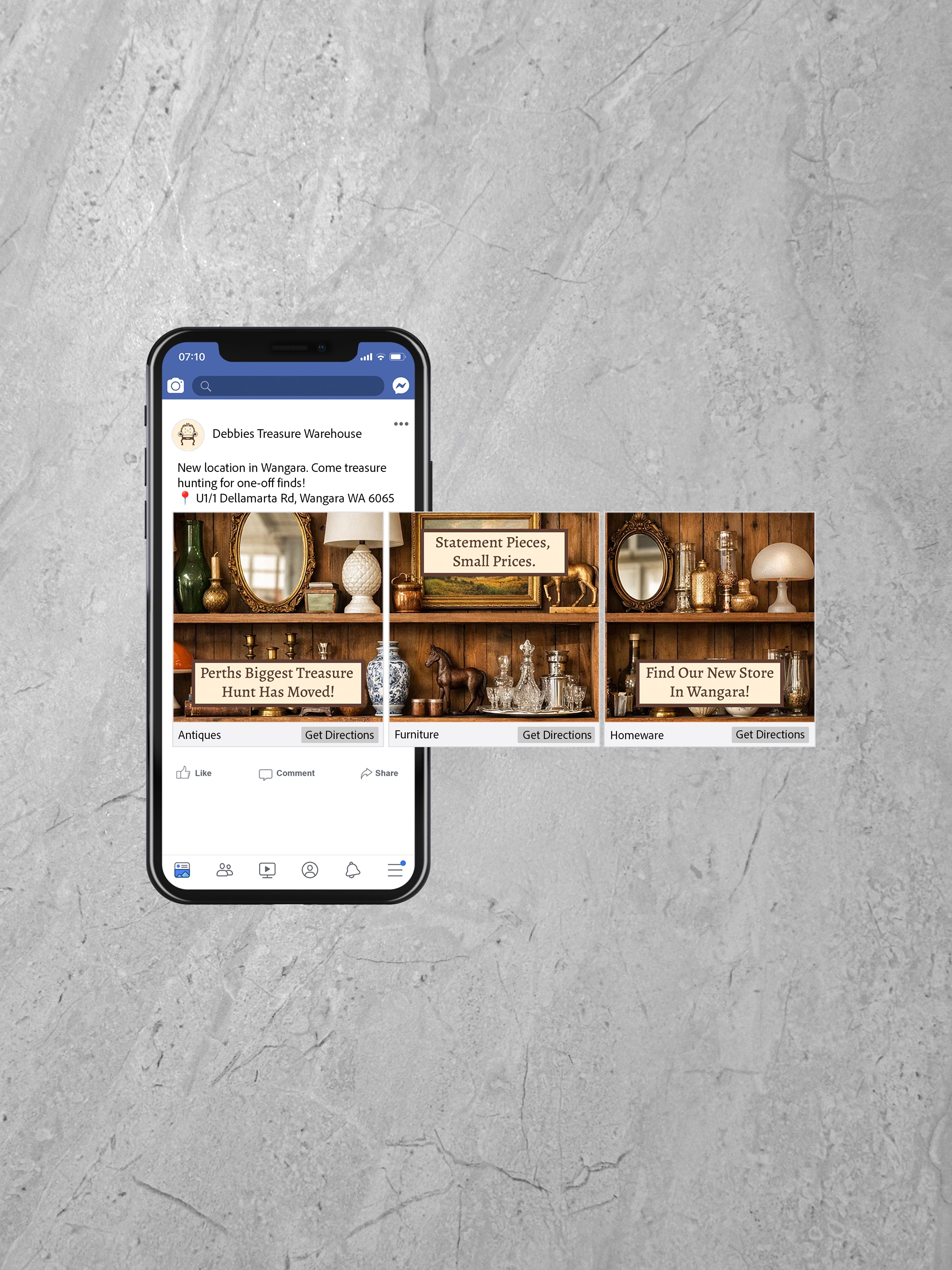 When I joined Debbie’s Treasure Warehouse, it had strong offline momentum but little digital presence. I helped define brand strategy, then developed the visual identity, brand assets, and a complete visual brand guide. I built the website with an SEO first approach, starting with thorough keyword research, then optimised the site every two months to improve conversions and support business goals. I also planned and delivered campaigns across Facebook, Instagram, and email, producing the ad creatives and copy for brand awareness and seasonal promotions, and grew the Instagram account to over 1,000 followers.